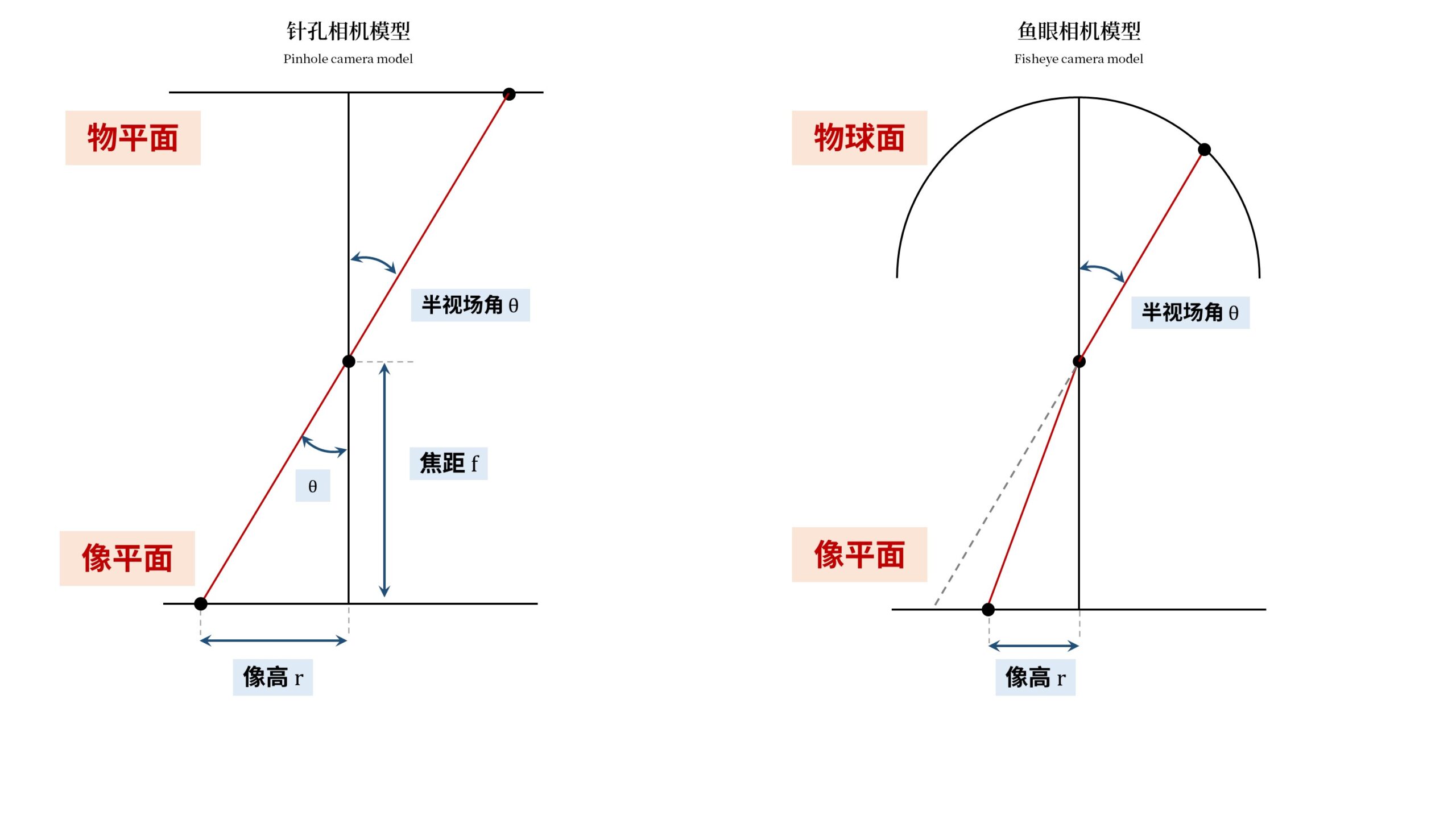 而在「鱼眼相机模型」里,通过引入桶形畸变,其成像是从「物球面」到「像平面」。