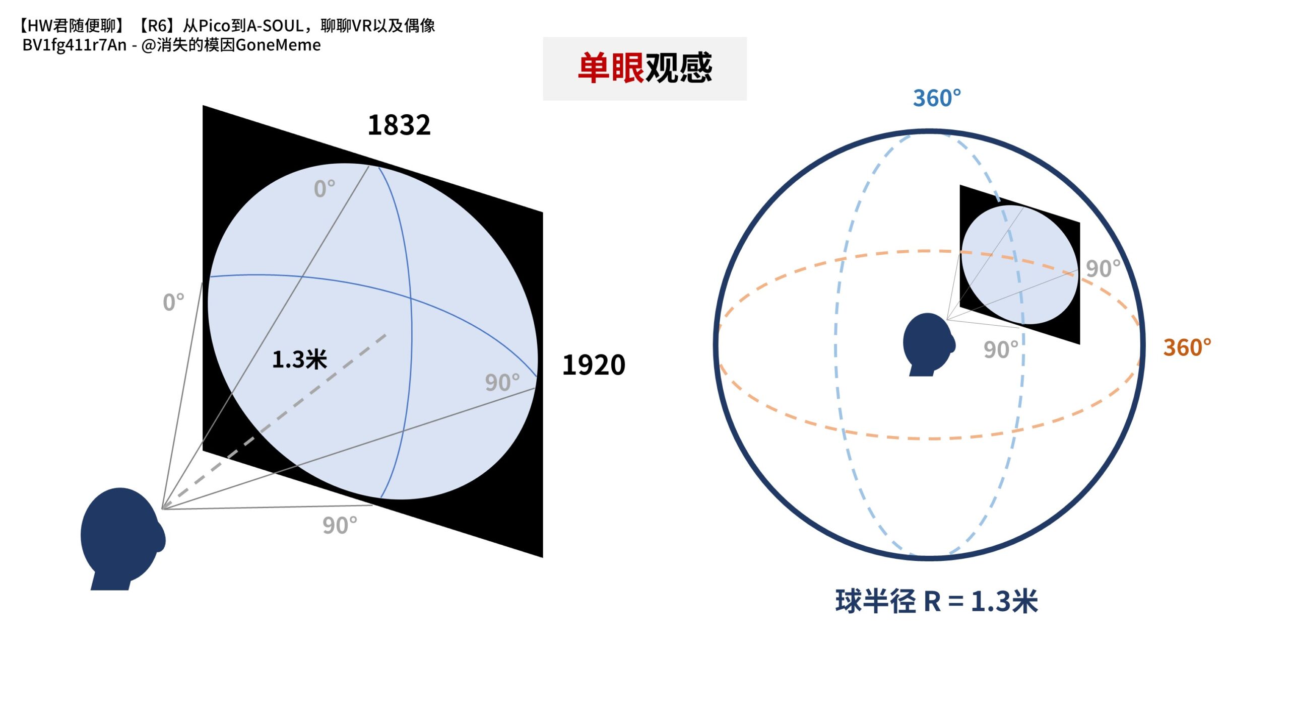 而像quest 2这样的VR眼镜,则虚拟出了2个半径为1. 3米的完整球面显示器,并且是左右眼不同的2个。