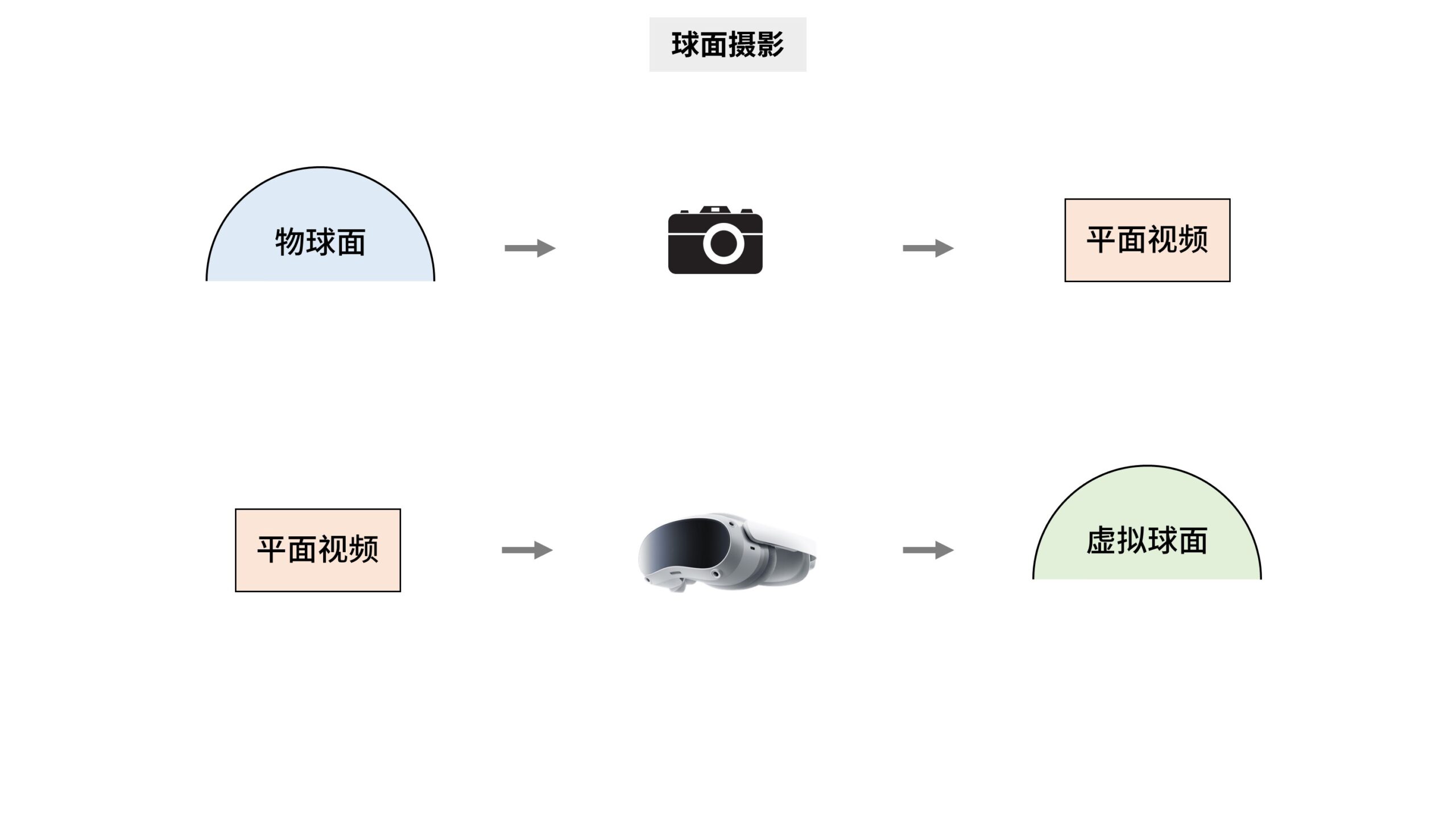 然后这个平面视频里的「像平面」,再通过VR眼镜进行还原,模拟重投影为「像球面」,于是得到了符合人眼自然观感的影像。