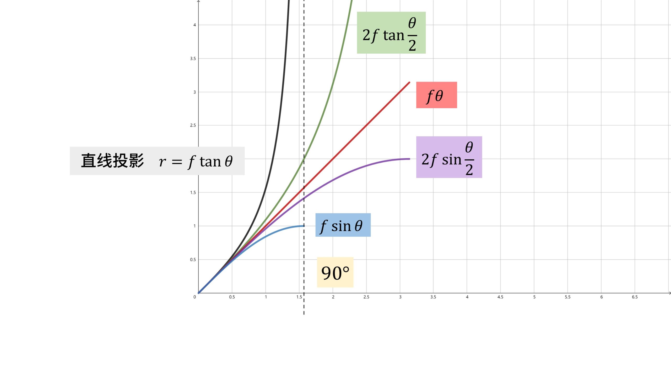 因此在「直线投影」下,如果要做180°的广角镜头,那么你的物平面和像平面都需要无穷大,这是无法实现的。