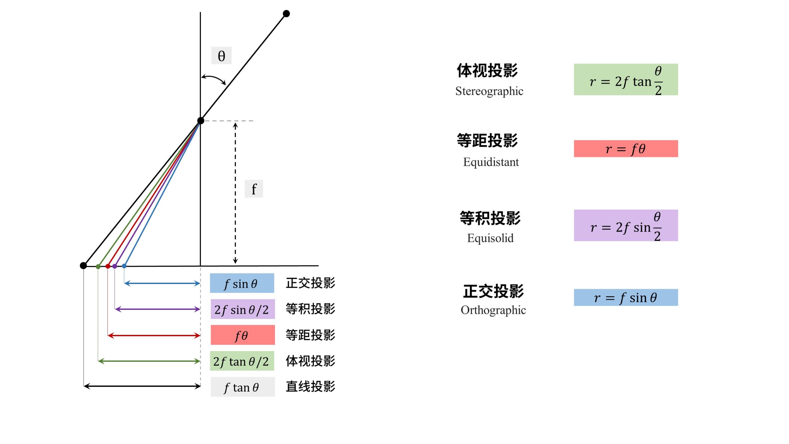 鱼眼镜头博主Thoby就统计过一些常见的鱼眼镜头的投影函数,眼花缭乱。