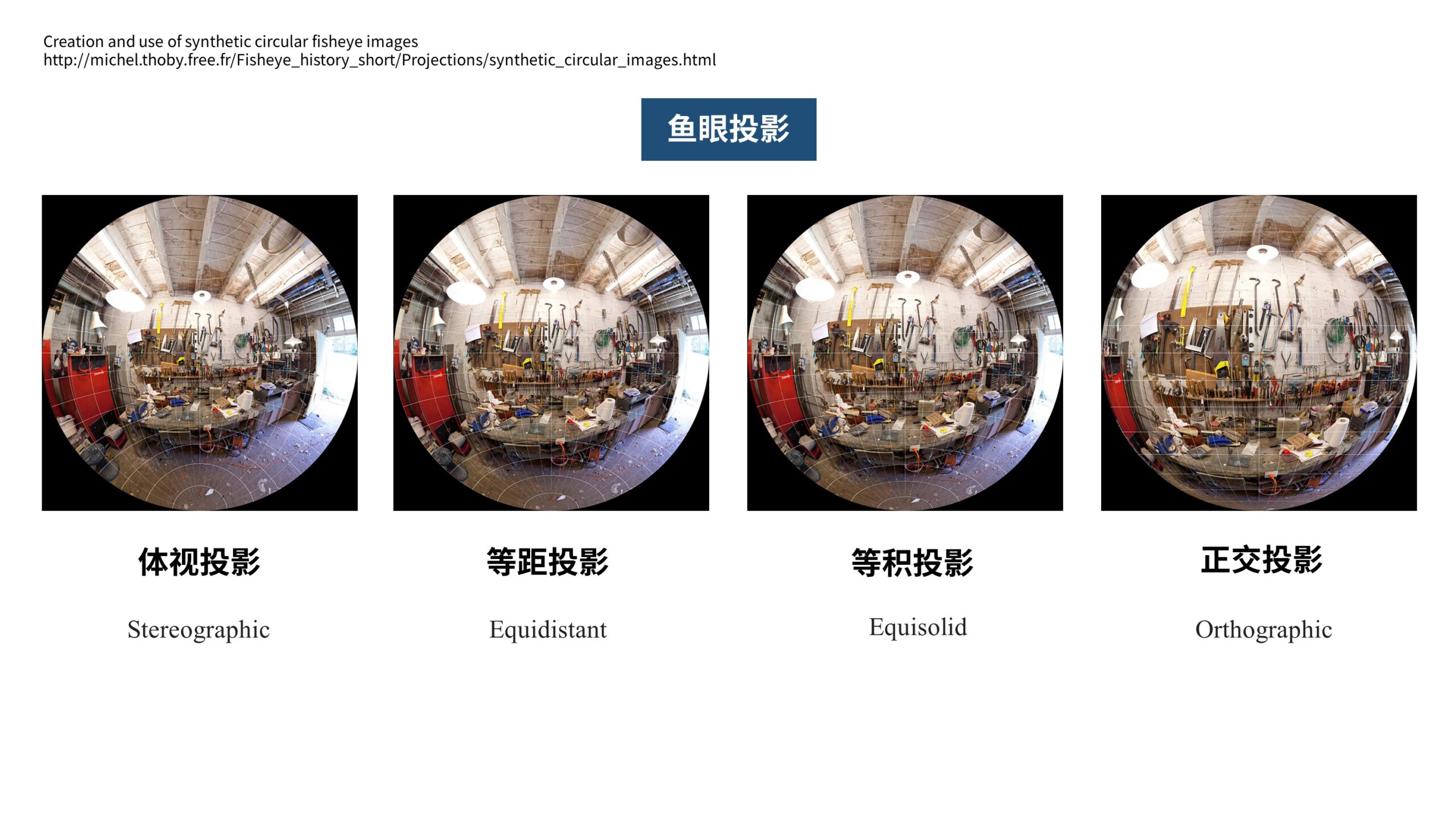 这类公式可以有很多种,这里介绍4种比较经典的公式,对应着4种经典的鱼眼投影。