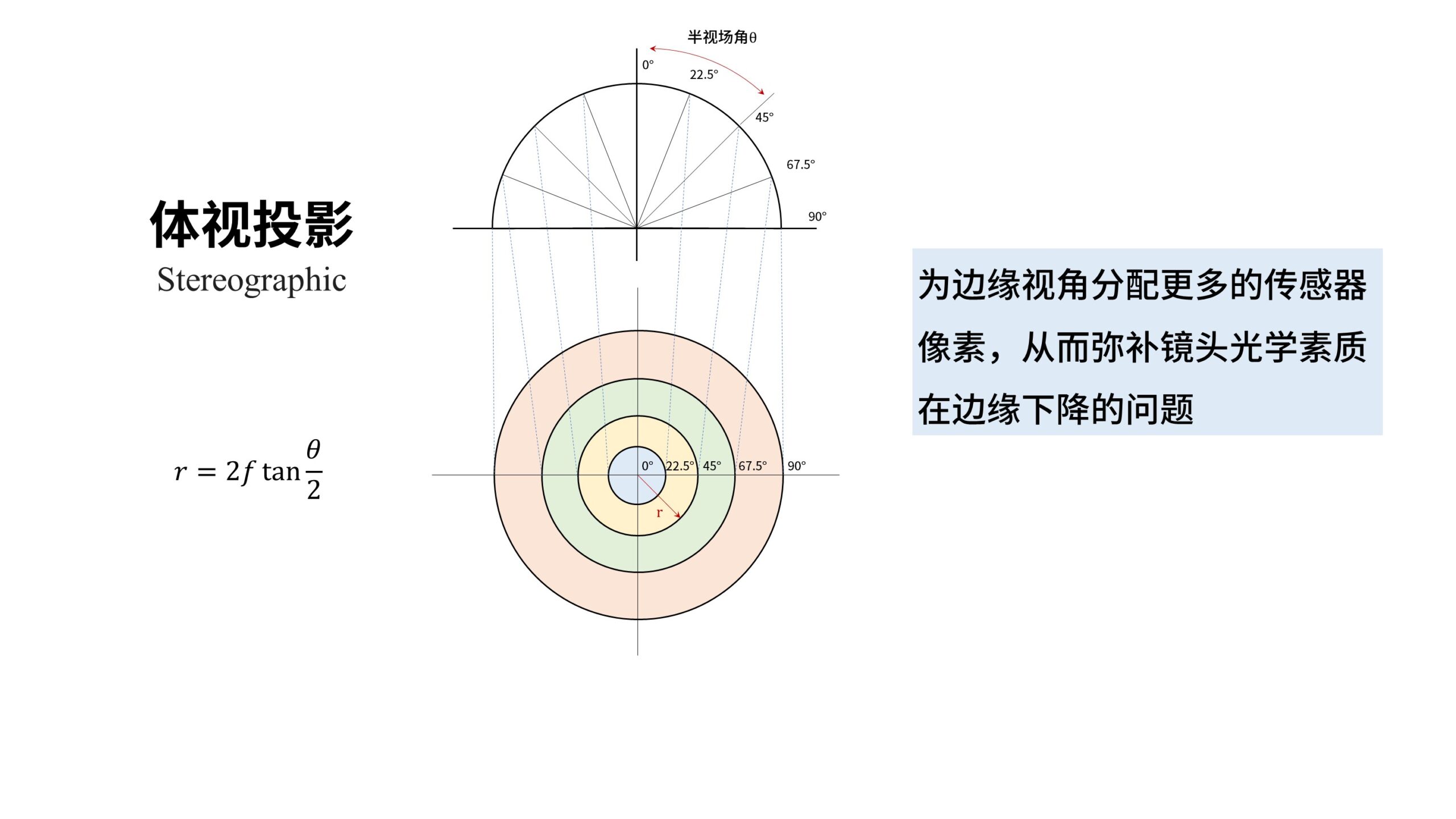 而使用「体视投影」可以为边缘视角分配更多的传感器像素,从而弥补镜头光学素质在边缘下降的问题,最终获得一个画质均匀的球面。