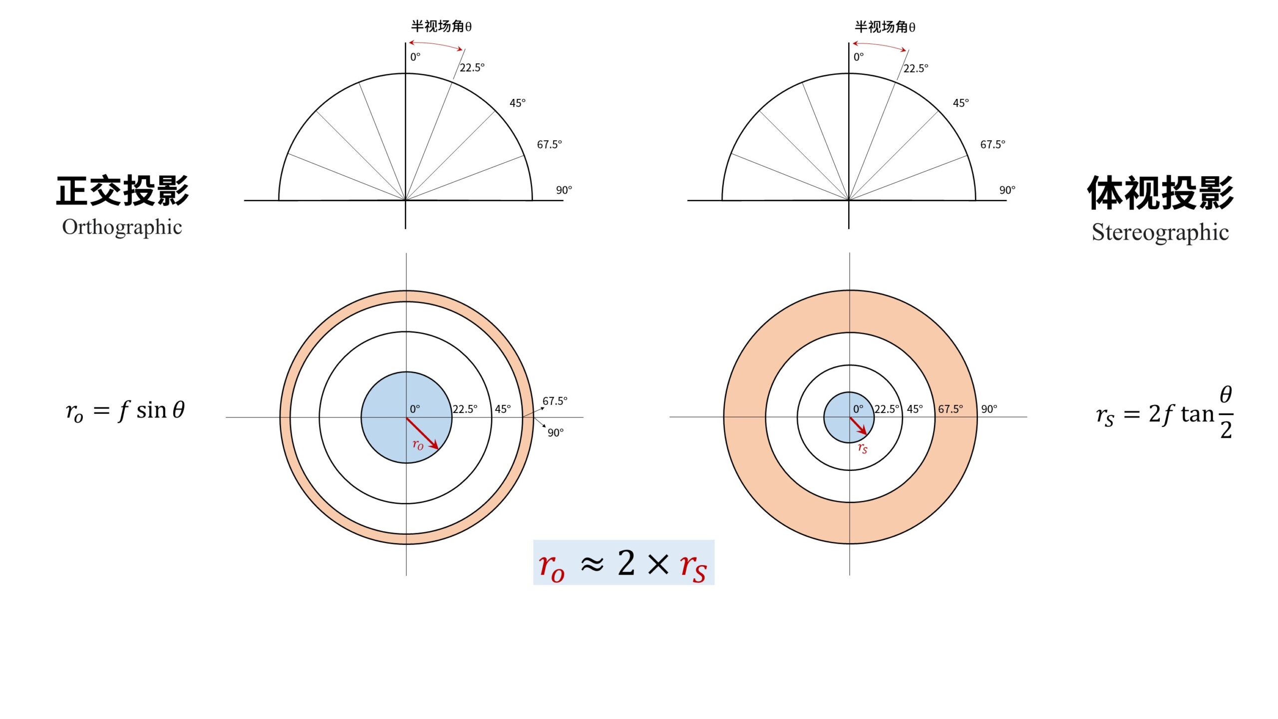 我们假设两个镜头其他参数相同,只是投影方式不同,一个是标准的「体视投影」,另一个是标准的「正交投影」