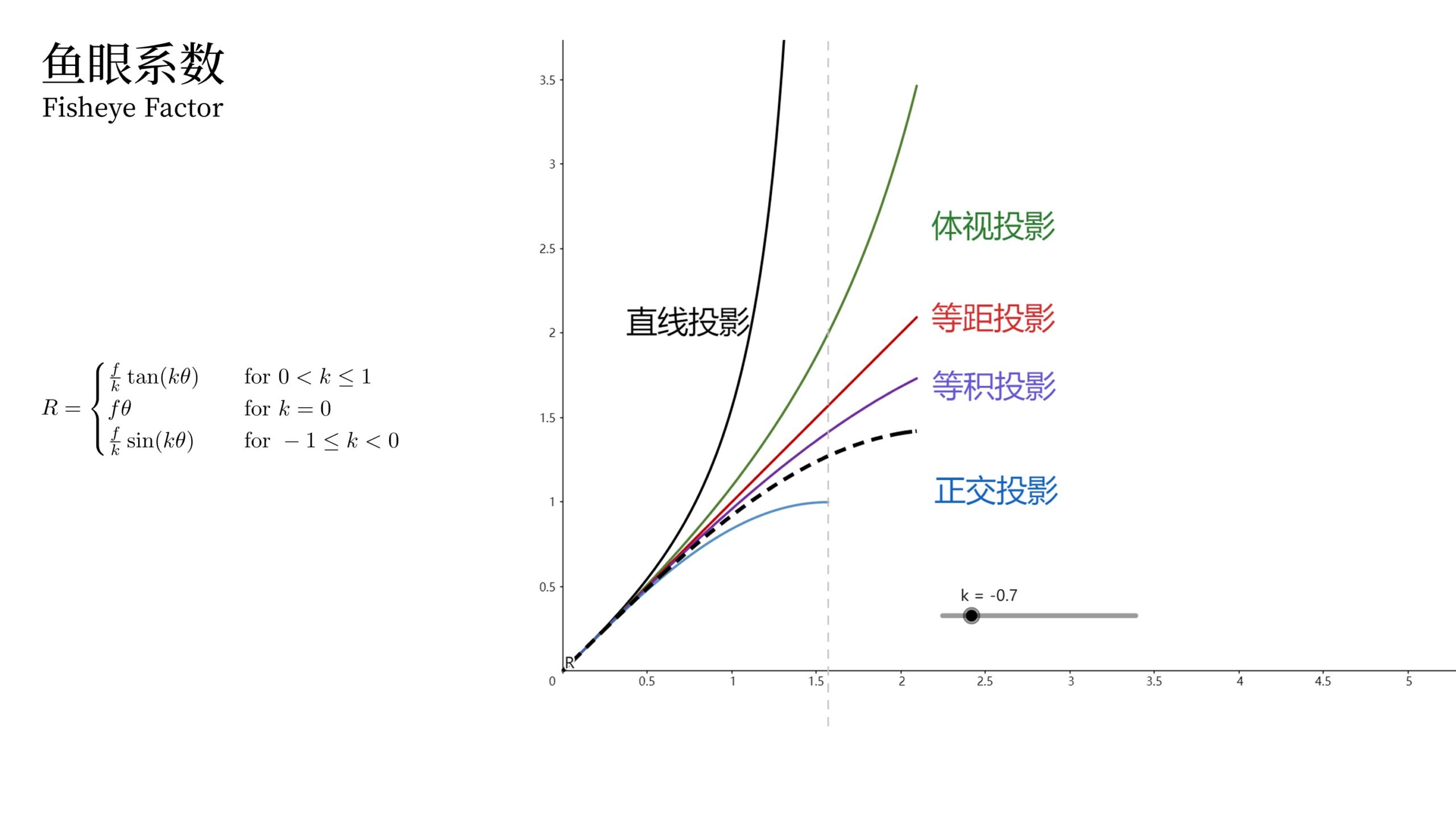 我们只需要调整1个参数,也就是k值,就可以大致上逼近不同的鱼眼投影函数。