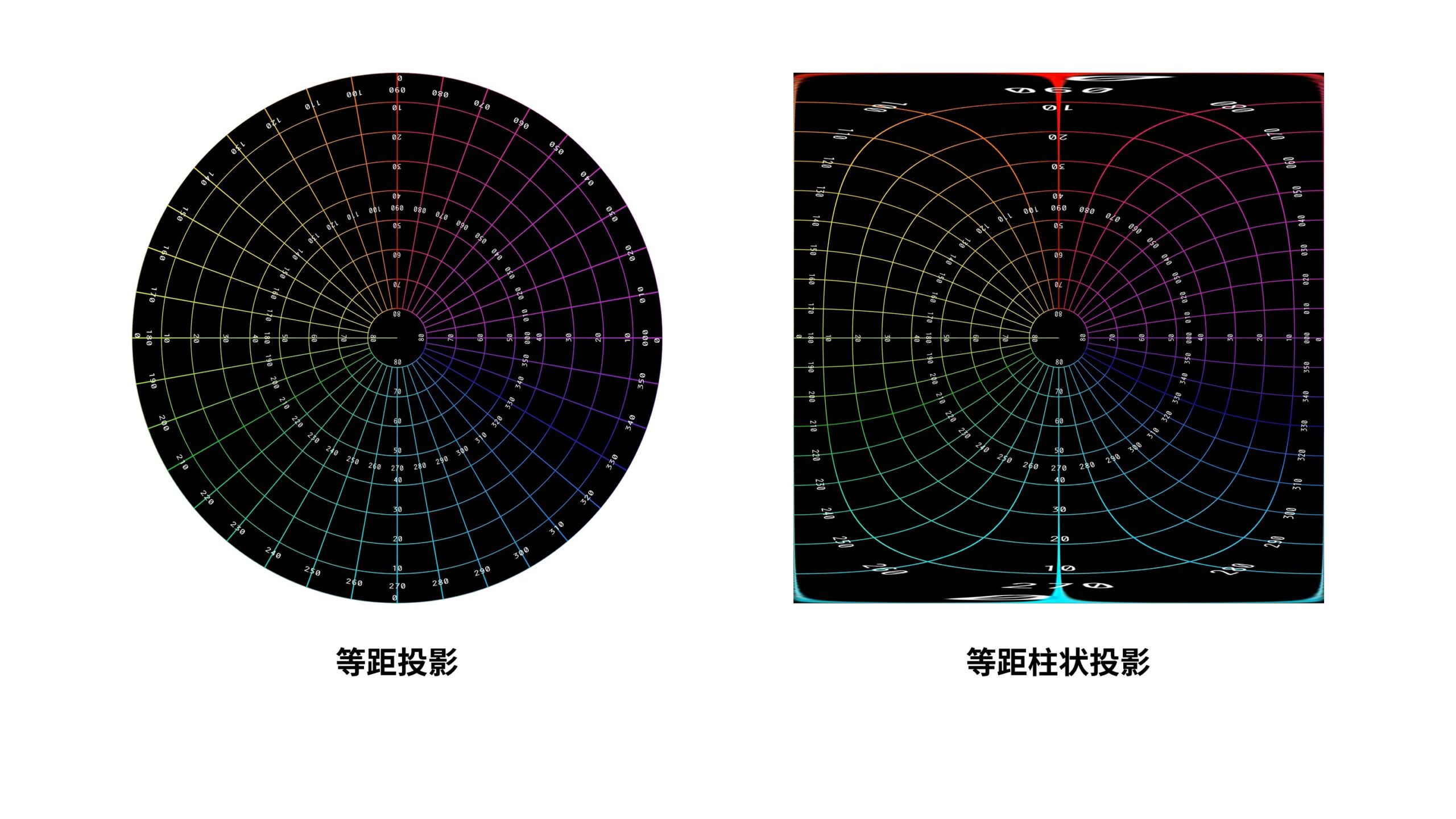 如图,把左边一个标准的180°「等距投影」的鱼眼图片,转换成「等距柱状投影」,可以明显看出它们之间的区别。