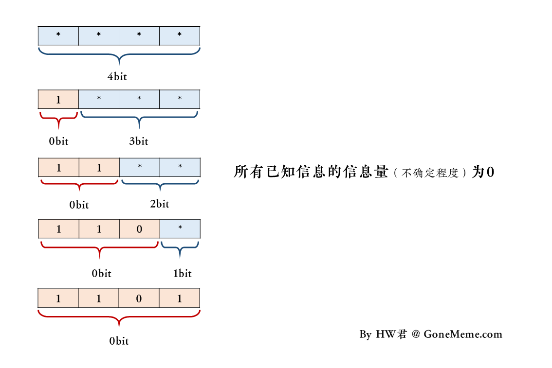 而状态为「110」的信息,用香农信息量公式求得的熵是0bit。